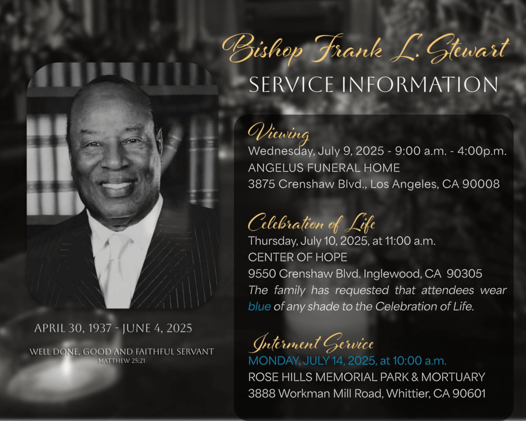 Celebrating the life of our brother who helped plant over 23 churches both domestically and abroud – Inglewood, Thursday, July 10, 2025