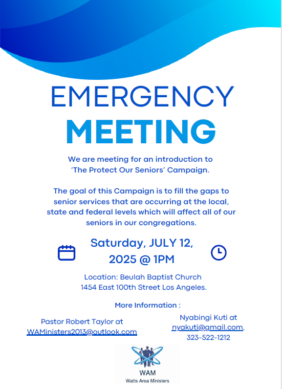 Protect Our Seniors Emergency Meeting conducted in partnership with the Watts Area Ministers at Beulah Baptist Church – Watts, Saturday, July 12, 2025