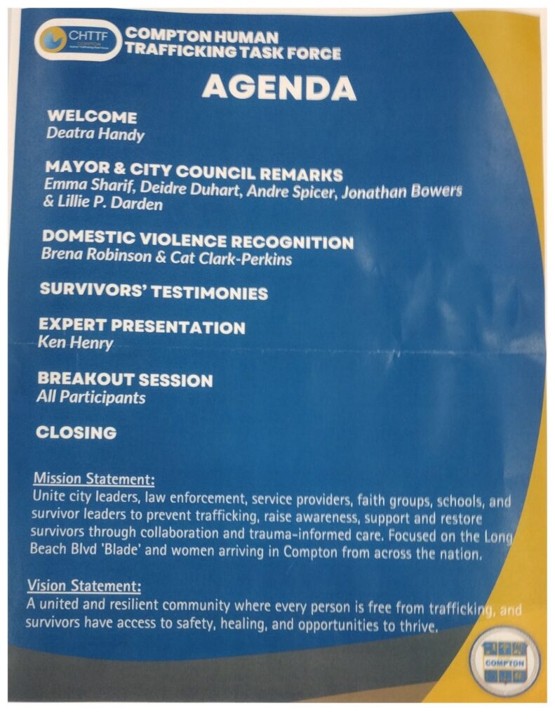 The S.A.L.T. is honored to now serve on both the Compton Human Trafficking Task Force and its Steering Committee, standing alongside dedicated community partners to confront one of our city’s most urgent crises.